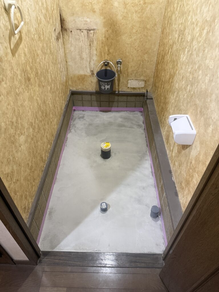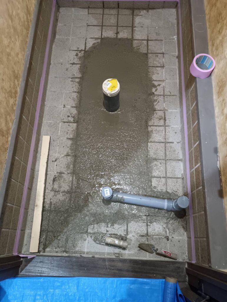 ↓既設トイレとタンクを撤去し、配管をします。今回は手洗い器を新たに設置するため、その排水配管もしています。既設便器を撤去したところは、コンクリートを入れてレベルを合わせています。